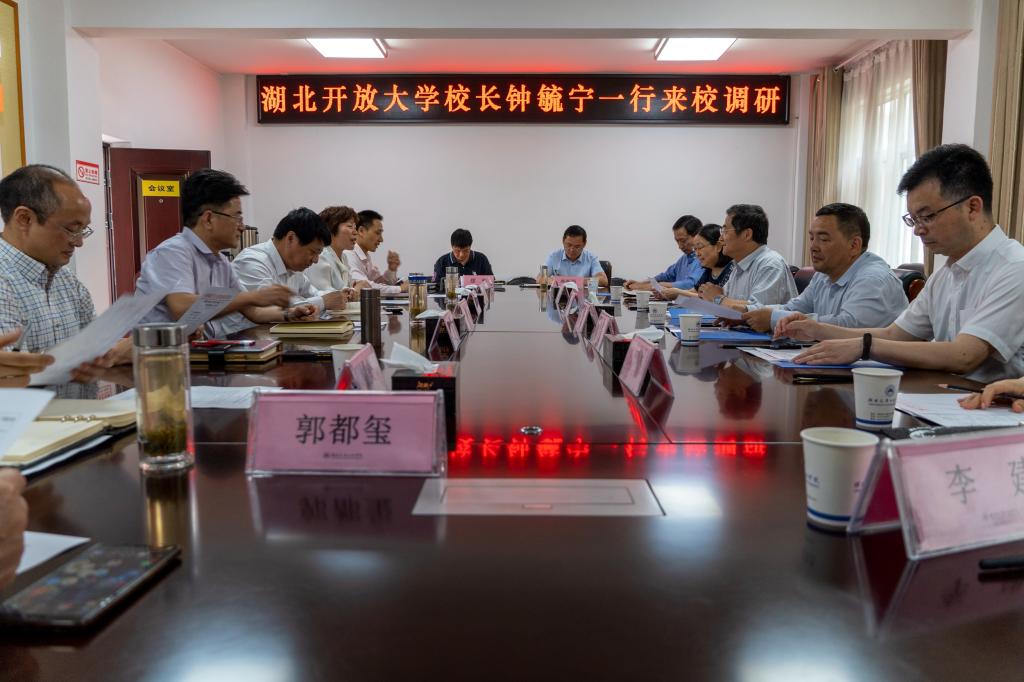 本网讯(文 朱志斌/图 陈嘉豪)5月12日下午,湖北开放大学校长钟毓宁、党委常委、副校长宋移安一行来我校调研,学校党委书记程红兵,党委副书记、校长张文学,党委常委、副校长张红霞,副校长张友兵及学校办公室(党办、校办)主任王文山陪同调研。
